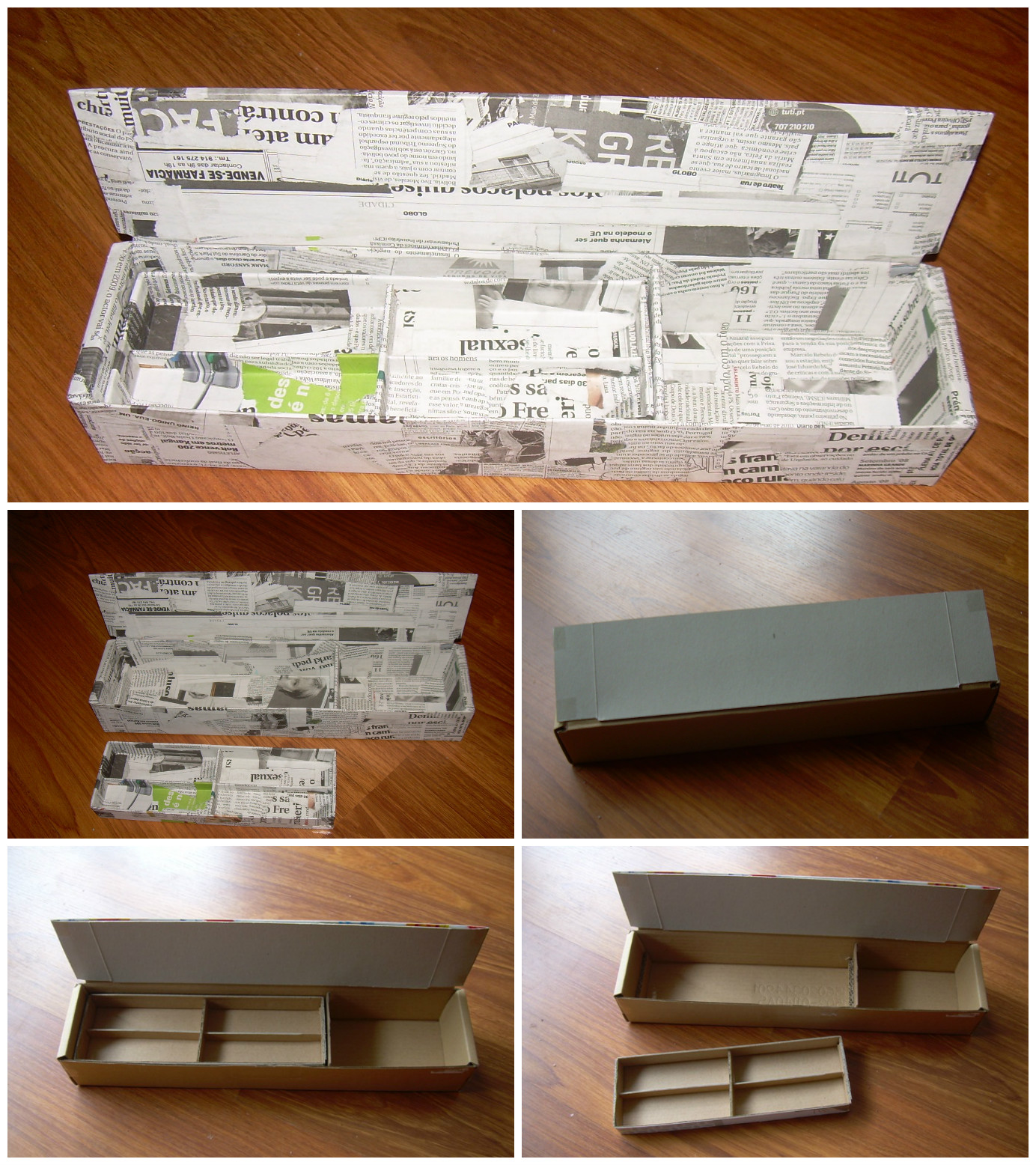 Materiais utilizados: Caixa de cartão, cartão, jornal e cola.
