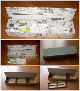 Materiais utilizados: Caixa de cartão, cartão, jornal, cola, tinta e verinz.